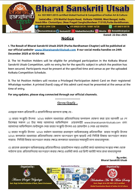 Bharat Sanskriti Utsab, an unit of Eklavya Global Social and Cultural Council, (Registration under Govt. of India), organised by Hindusthan Art & Music Society, is an ISO 9001: 2015 certified Global Competition & Festival. It is also registered to MSME,(Govt. of India), Kolkata Municipal Corporation & certified from Central Vigilance Commission, (Govt. of India) & National Human Rights Commission of India, Govt. of India. Eastern Zonal Cultural Centre, (Minister of Culture), Indian Council of Cultural Relations (Dept. of Forgien affairs, Govt. of India)Financially, it is supported by the Ministry of Culture, Govt. of India.
