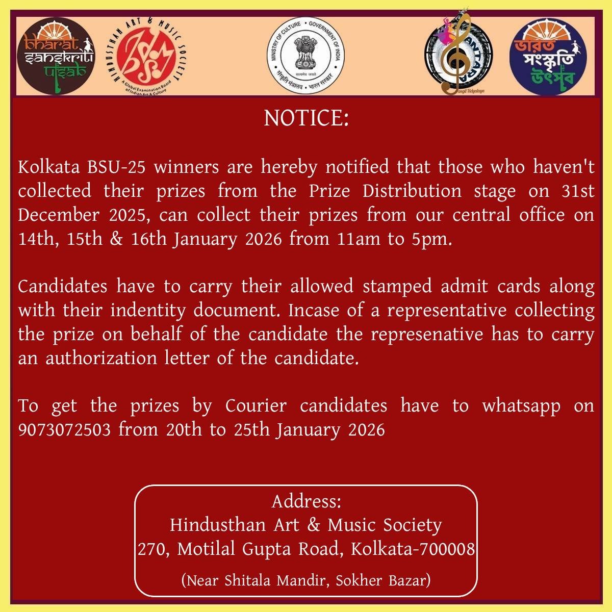 Bharat Sanskriti Utsab, an unit of Eklavya Global Social and Cultural Council, (Registration under Govt. of India), organised by Hindusthan Art & Music Society, is an ISO 9001: 2015 certified Global Competition & Festival. It is also registered to MSME,(Govt. of India), Kolkata Municipal Corporation & certified from Central Vigilance Commission, (Govt. of India) & National Human Rights Commission of India, Govt. of India. Eastern Zonal Cultural Centre, (Minister of Culture), Indian Council of Cultural Relations (Dept. of Forgien affairs, Govt. of India)Financially, it is supported by the Ministry of Culture, Govt. of India.